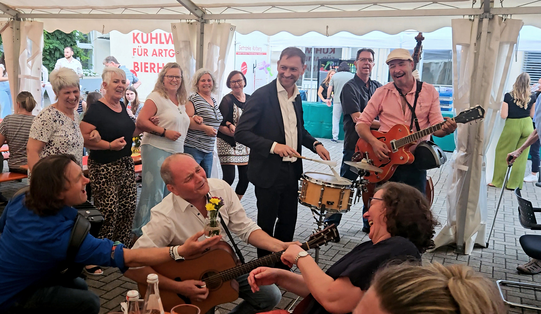 Wir brauchen keine Bühne, keinen Strom und keine künstlichen Hilfsmittel. Wir schnappen uns einfach unsere Instrumente, 2 Gitarren, Kontrabass, Percussions und Akkordeon und 5 stimmiger Satzgesang. Mal Leadvocals als auch Backingvocals. Meistens mehrstimmig aber immer stimmig.